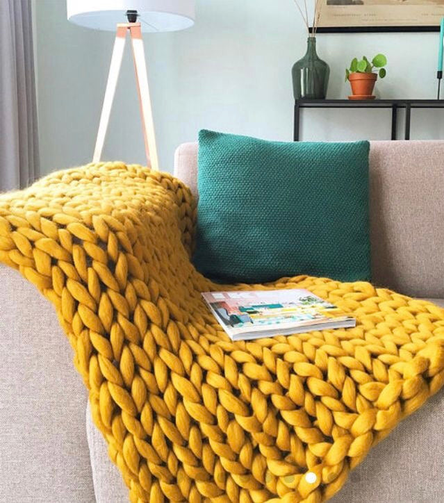 Manta tejida en 100% lana merino, suave, cálida y liviana. El tono mostaza, un amarillo terroso y profundo, aporta calidez y carácter al ambiente. Ideal para usar en el sofá, abrigarte en las tardes frescas o sumar textura a tu decoración.