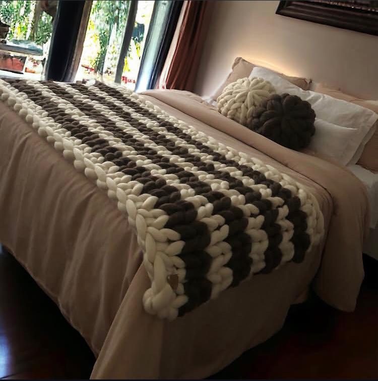 Tejido en lana 100% natural, sin teñir, en tonos tierra que armonizan con el cálido chocolate.